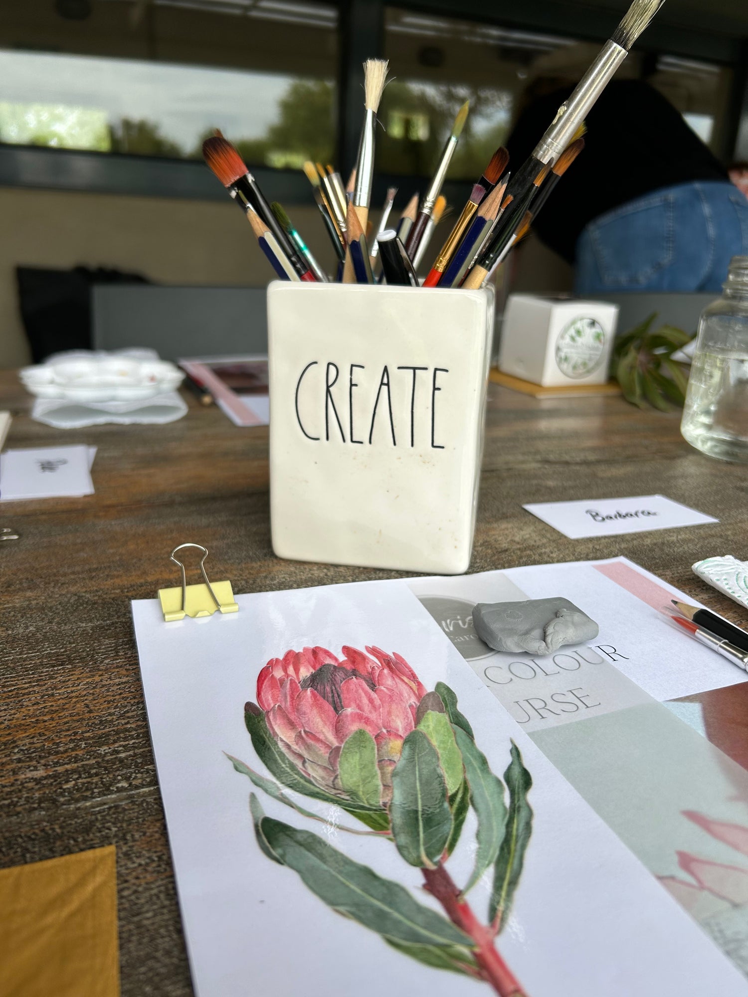 We painted a protea — something I honestly thought would be far too difficult for me — but Caron broke it down step by step, making the process feel approachable and fun. She gave us the freedom to experiment while guiding us with techniques that made the painting come alive. By the end, I had a protea on paper that I was genuinely proud of!